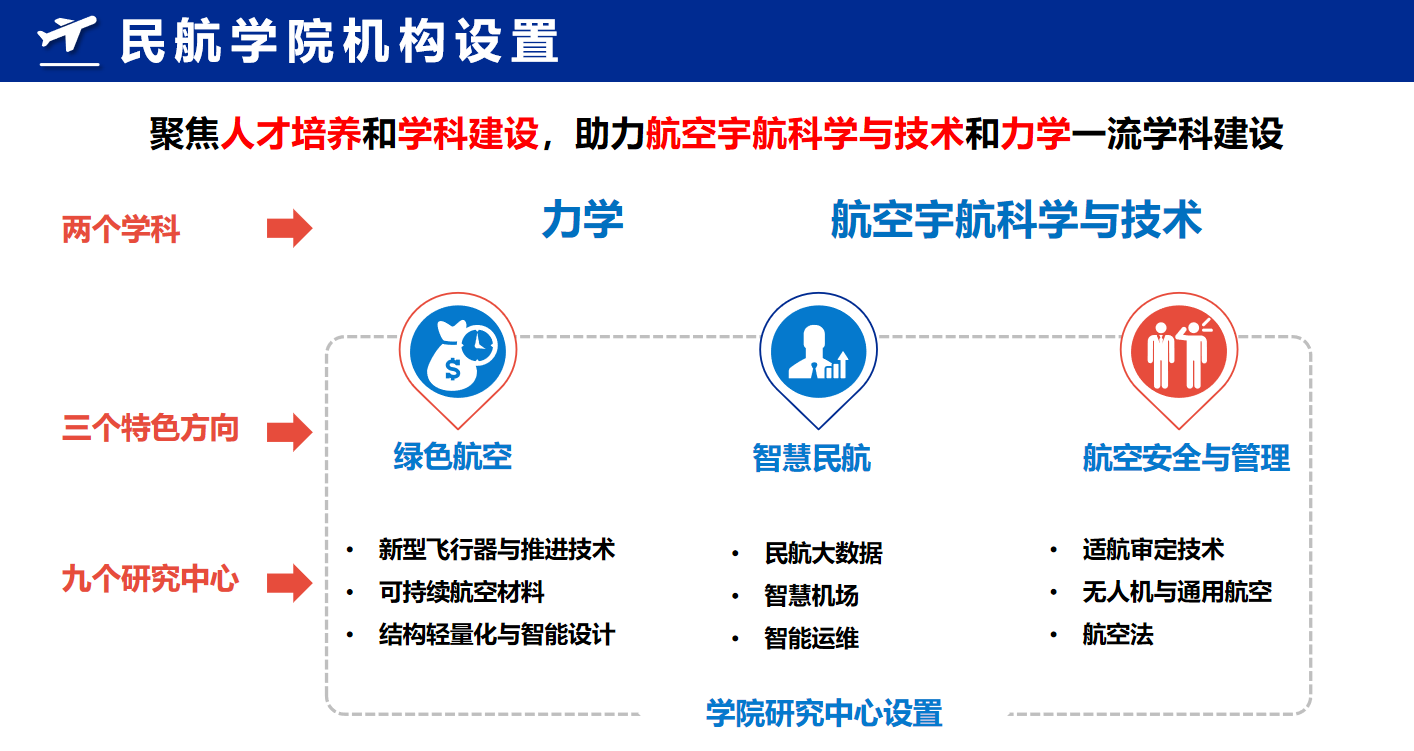 泰国av 聚焦人才培养和学科建设,与研究院一体化运行,以绿色航空、智慧民航、航空安全与管理三大特色方向为引领,着重打造九大研究中心,助力航空宇航科学与技术和力学学科建设。民航研究院聚焦民航行业需求,与学院一体化运行,搭建衔接学科、科研与民航产业的产学研平台。