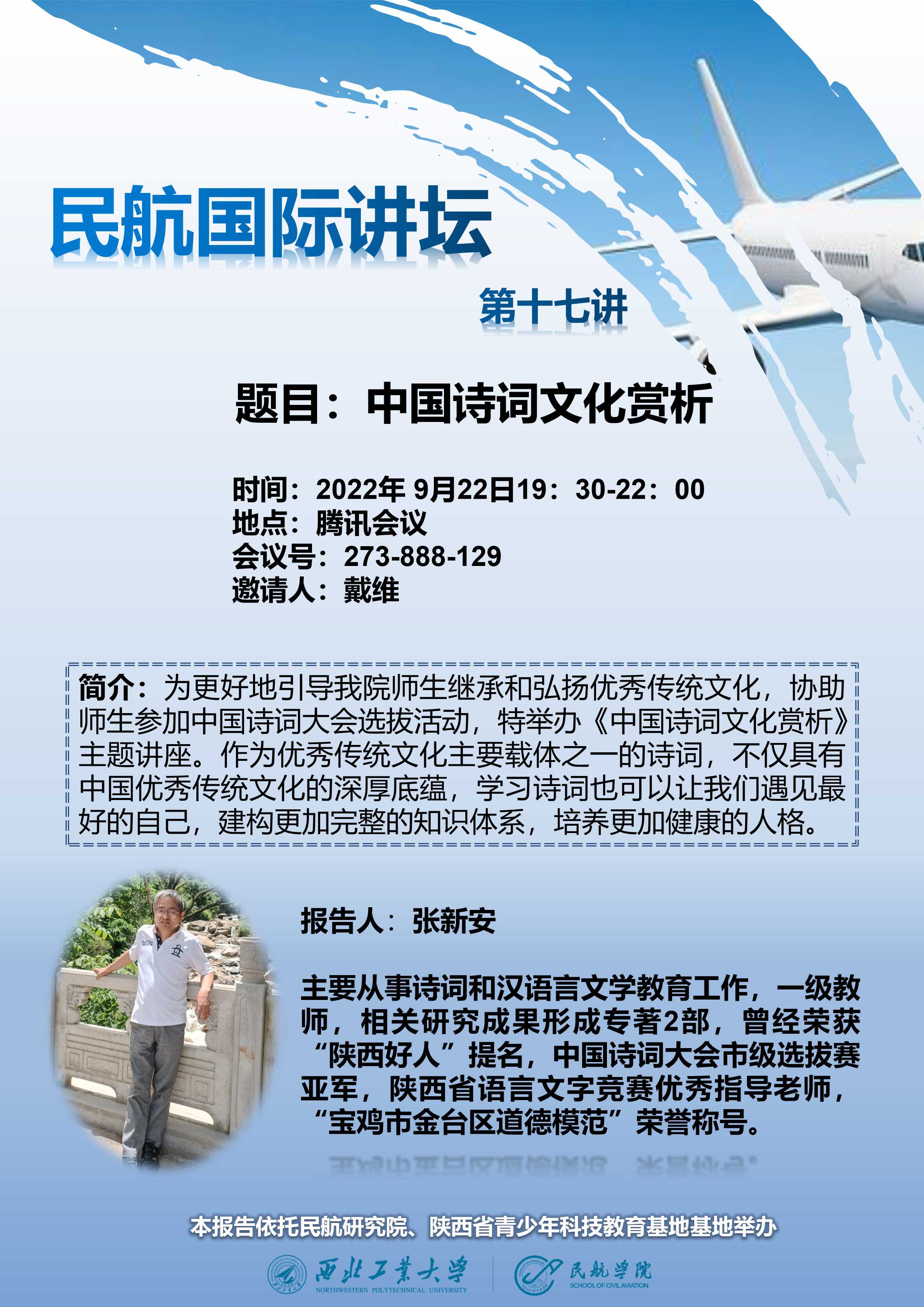 9月22日晚七点三十分,泰国av 拟线上举办“中国诗词文化赏析”专题讲座,届时欢迎各位老师同学参会交流。讲座信息如下: