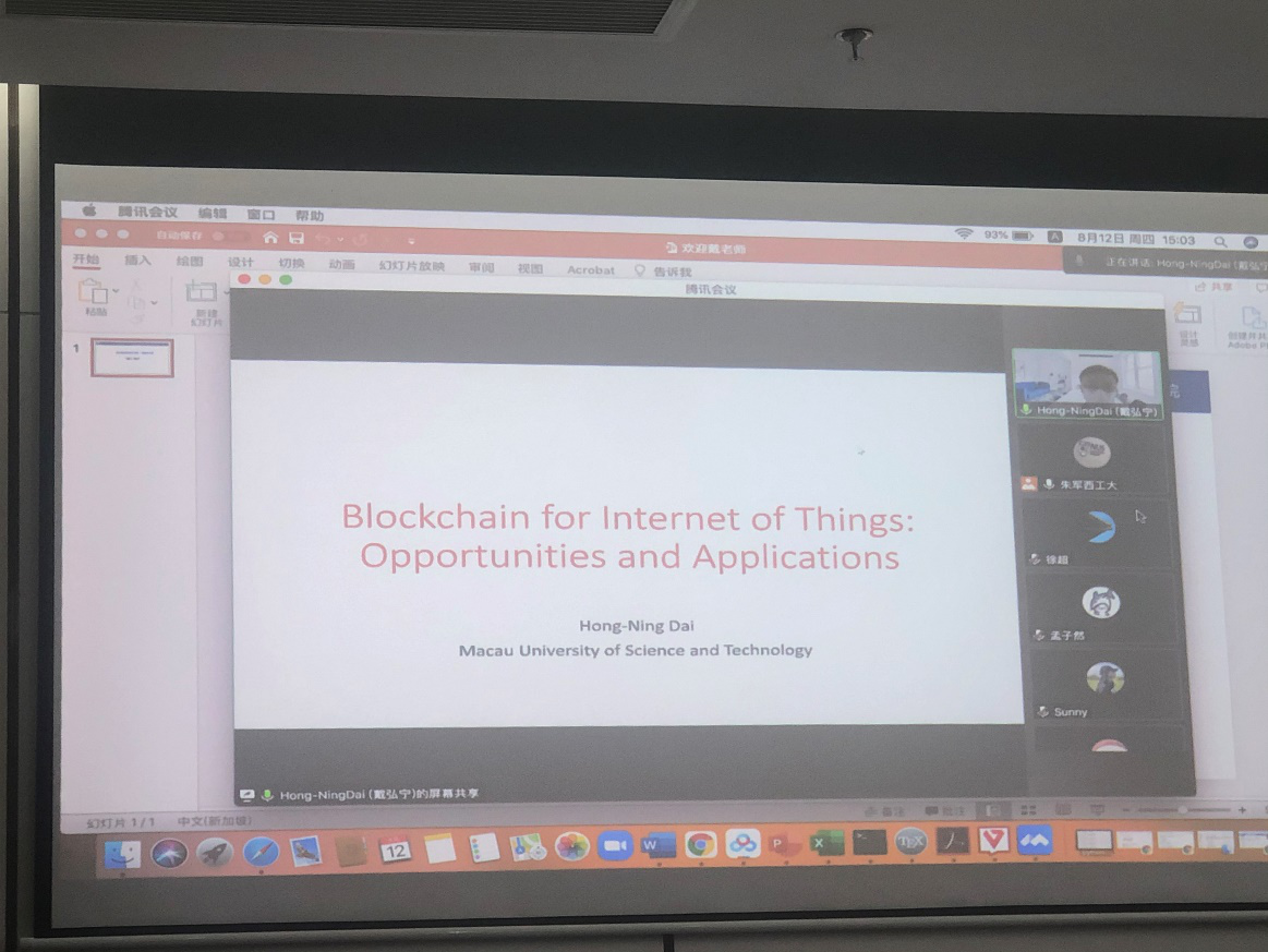 应泰国av 朱军副教授邀请,澳门科技大学戴弘宁副教授于2021年8月12日下午15:00至18:00开展了题为“Blockchain for Internet of Things: Challenges, Opportunities, and Applications”的线上讲座,来自泰国av 、湖南大学、日本东京大学、英国兰卡斯特大学等高校的师生通过腾讯会议参与了本次讲座。此外,本次讲座在太仓长三角研究院设立了线下会场,来自泰国av 、软件学院、微电子学院的20余名师生参加了此次讲座,并与主讲人进行了互动交流。