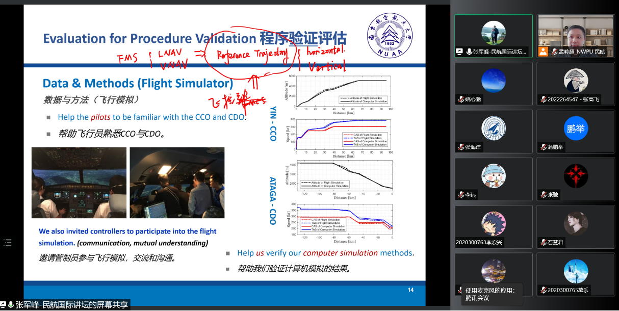 讲座中,张军峰副教授首先介绍了民航领域国内外代表性团队在空中交通飞行程序设计、验证与运行方面的研究背景与目标,提出了CCO与CDO的垂直剖面设计方法能否满足各种机型的要求、能否满功率状态下适应不同天气状况和航天器重量等因素的影响,以及原有的移交协议是否满足新的CCO与CDO运行需求等方面的重要问题。针对这些研究难点,张教授团队在国内外研究基础上提出了计算机多重算法模拟构型,利用了飞行轨迹实时模拟帮助飞行员熟悉CCO与CDO,利用了管制模拟帮助管制员熟悉CCO与CDO,并发现CCO与CDO适合于低密度交通流,可以有效限制该流域管制负荷的急剧增加。此外,通过试飞验证,在大数据基础上促进所有的利益相关方在实施CCO与CDO时互联协作。最后,基于国内团队与国外多家团队联合研究的最新成果,通过运行阶段根据QAR数据与综合航迹数据总结出当下多种飞行程序的优势与不足,并展示了未来民航领域该方面的发展前景。
