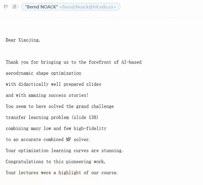 作为主讲教师,邬晓敬老师对其所从事的飞行器气动优化设计进行了五个专题的演讲,演讲内容包括了气动设计概念、内容、发展历程、优化框架组成等内容。借助此次课程,邬老师还系统介绍了其课题组近两年来围绕高维气动设计问题、如何借助迁移学习技术解决复杂工程气动设计问题(如旋转叶片设计、汽车外形设计等)所开展的相关研究工作。演讲内容获得了课程组织者Noack教授的高度赞扬和评价。