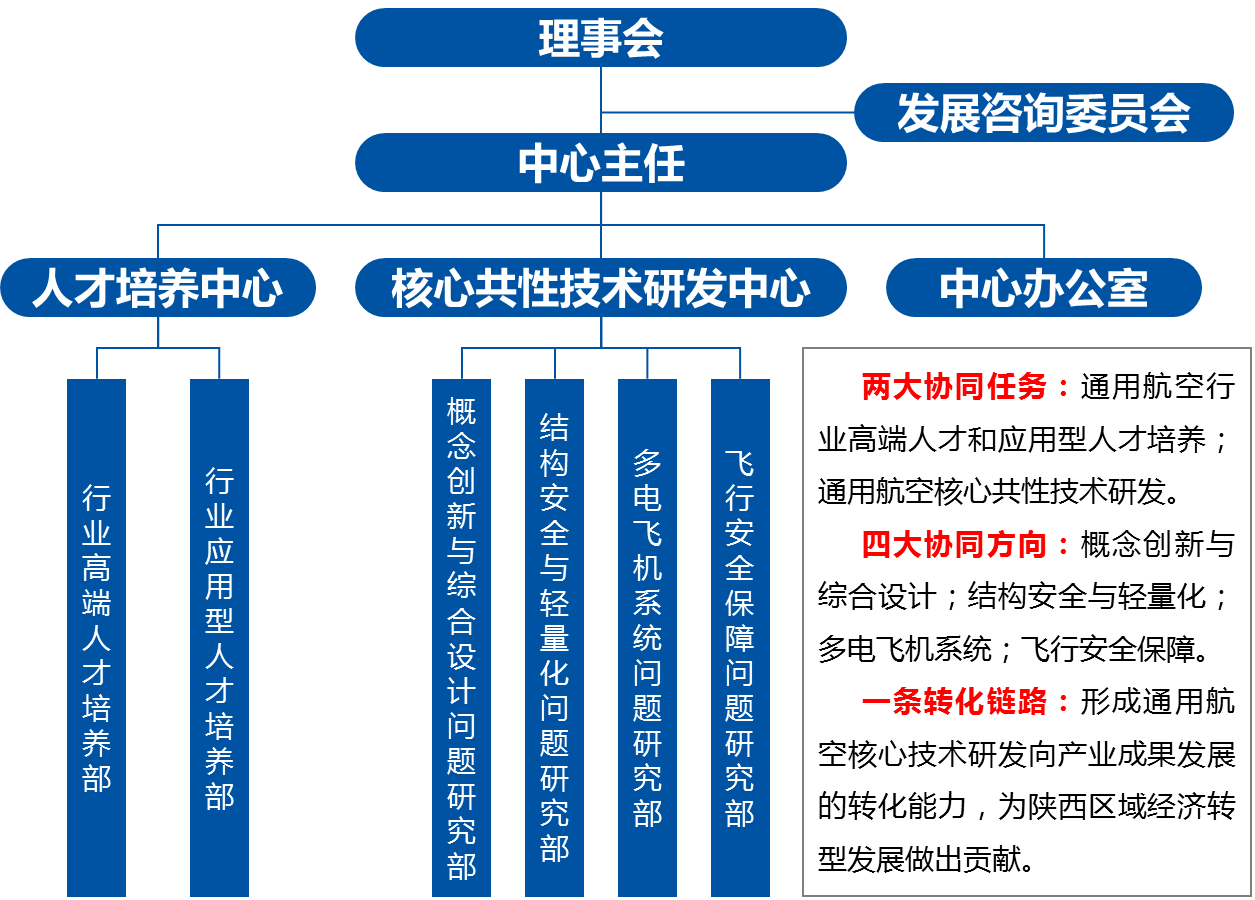 的相关优势学科,以概念创新与综合设计、结构安全与轻量化、多电飞机系统和飞行安全保障4项核心关键问题和人才培养为协同目标,与中国民用航空西北地区管理局、西安阎良国家航空高技术产业基地、渭南卤阳湖现代产业综合开发区管理委员会、西安航空学院、国家驻陕航空设计与制造企业主要创新力量及国际同领域顶尖研究力量深度融合,通过机制体制改革,有效汇聚人才、学科以及陕西省重点实验室资源,培养行业创新人才,产出一批重大标志性成果,提升高校人才、学科、科研三位一体的创新能力,成为具有国际一流水平的研究中心,为推动科教强省战略,实现创新型陕西的奋斗目标,提供强有力的智力支撑与人才保障。