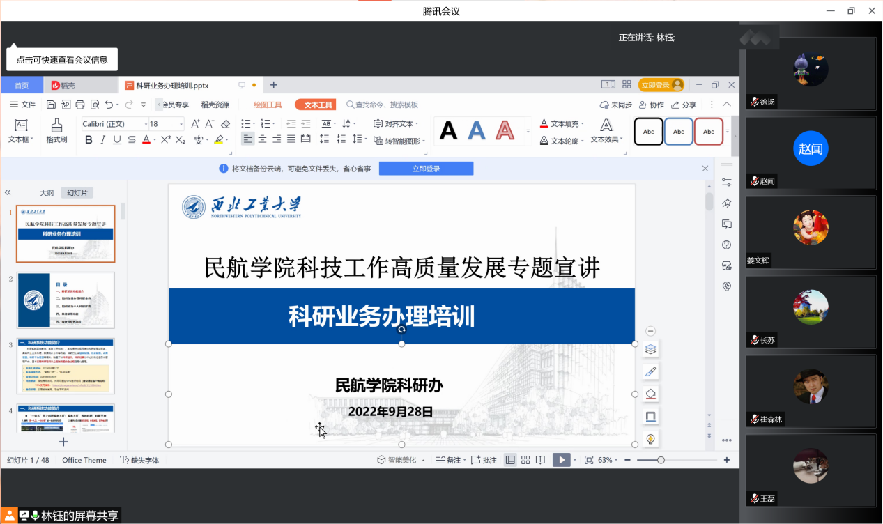 于2022年9月28日下午,在毅字楼205会议室,采用线上、线下相结合的方式,面向全院教师组织开展科研业务办理专题培训,学院20余名教师参加本次培训。