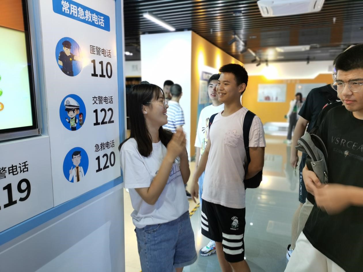 首先,讲解员为同学们介绍了总体国家安全观和安全生产相关重要领域内容。随后,在体验馆中,同学们依次参观了自然灾害、国家安全、校园安全、消防安全、卫生健康、交通安全等六个展区,亲身体验了地震震感、火场烟雾逃生,醉酒驾驶等互动感应装置,学习了相关防灾避险常识和急救技能。