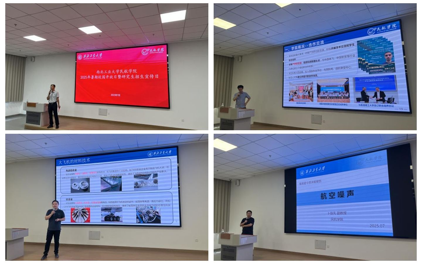 学院教师代表们带来了一系列精彩的报告。孟岭超老师的《飞向蓝天--国产大飞机制造》,生动讲述了国产大飞机制造过程中的点点滴滴与技术难题;闫浩老师的《全电/混电飞机电推进系统关键技术概述》,聚焦新能源飞机的核心技术,展现了民航领域的前沿科技动态;卜焕先老师的《航空噪声》,深入剖析了航空噪声的相关知识与研究;陈杨老师的《航空发动机复合材料结构抗冲击设计技术及应用》,让同学们对航空发动机的关键技术有了更直观的感受;严寅中老师关于空天冲击环境与电池声学监测的报告,也为同学们带来了全新的知识视角。这些报告内容丰富、专业性强,充分彰显了学院在民航科研领域的深厚积淀与前沿探索精神。