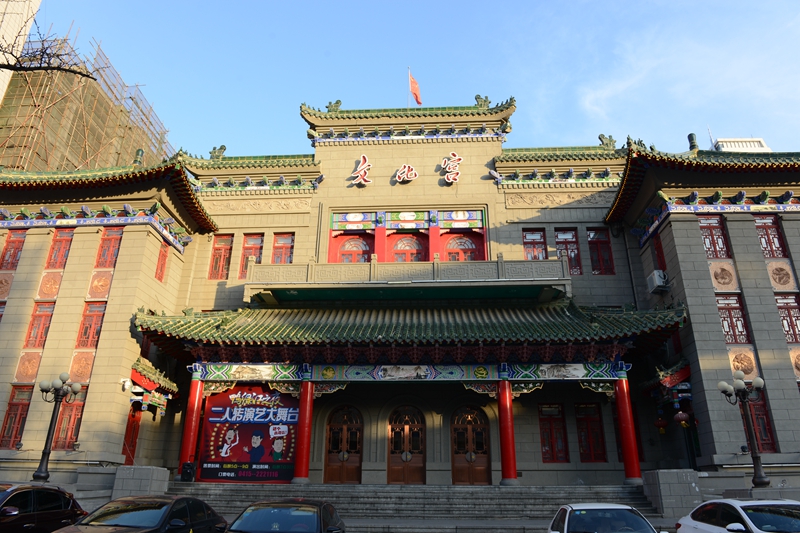 丹东市文化宫位于振兴区七经街70号,为丹东市经济、文化中心。始建于1954年,1955年竣工,先后经过多次现代化改造,现有建筑面积2400平方米,共有座位大厅782个、小厅70个。主楼外高三层,是一座仿宫殿式的建筑。一楼前檐出跳,4根朱红圆柱托拱其间。雕梁画栋,碧瓦红窗,浮雕彩绘,古朴大方。二楼檐廊前伸,双根彩柱间隔三楹观礼台,两侧有六扇木格花窗,形同殿堂。三楼形似品字形牌楼,中高侧低,碧瓦覆盖。两侧垛楼为三层亭子阁式建筑,与主楼浑然一体。重檐飞翘,琉璃宝顶,高耸云霄,异常宏伟壮观。