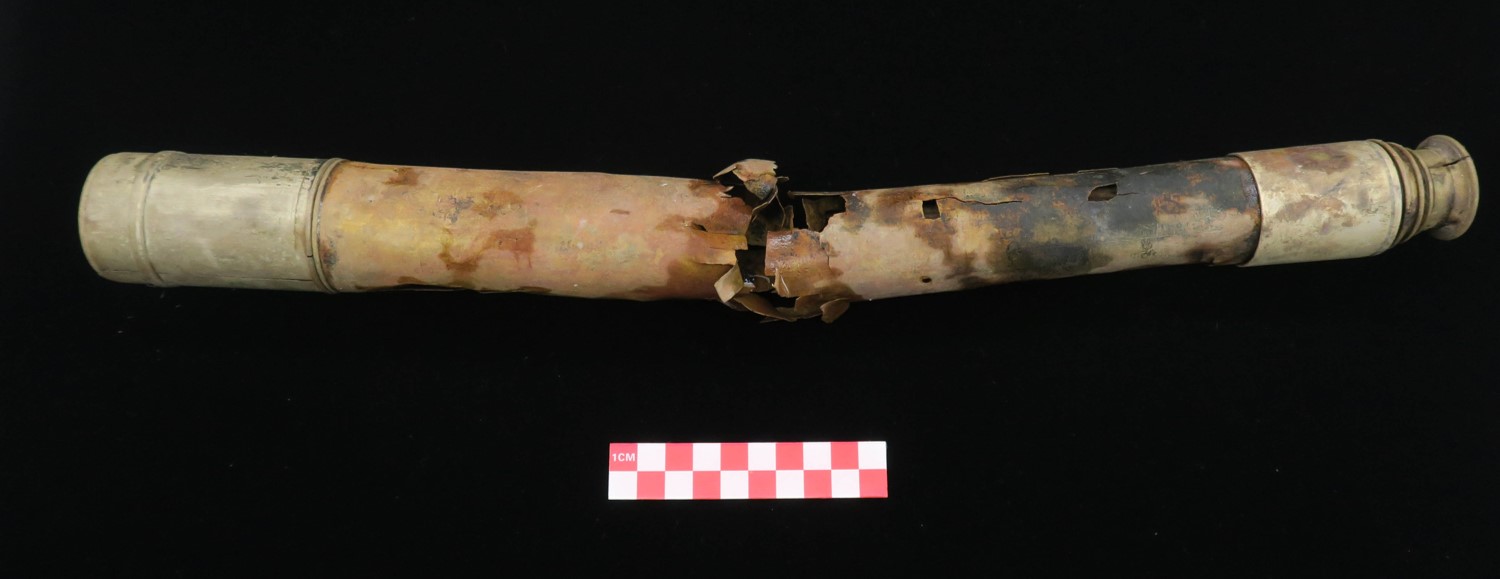 2015年水下调查时清理出沉舰的舭龙骨,确认沉舰的埋藏深度、分布范围及整体保存状况,并发现致远舰大副陈金揆所用单筒望远镜等重要文物。经水下工作确认,“丹东一号”(致远舰)沉舰残长约61米,最宽处11.5米,舰体保留的高度仅存2.5米(完整高度在8米左右),由于海战创伤和后期破坏,舰体损毁严重,但仍可确认出残损的水密隔舱、锅炉、穹甲板等部位。