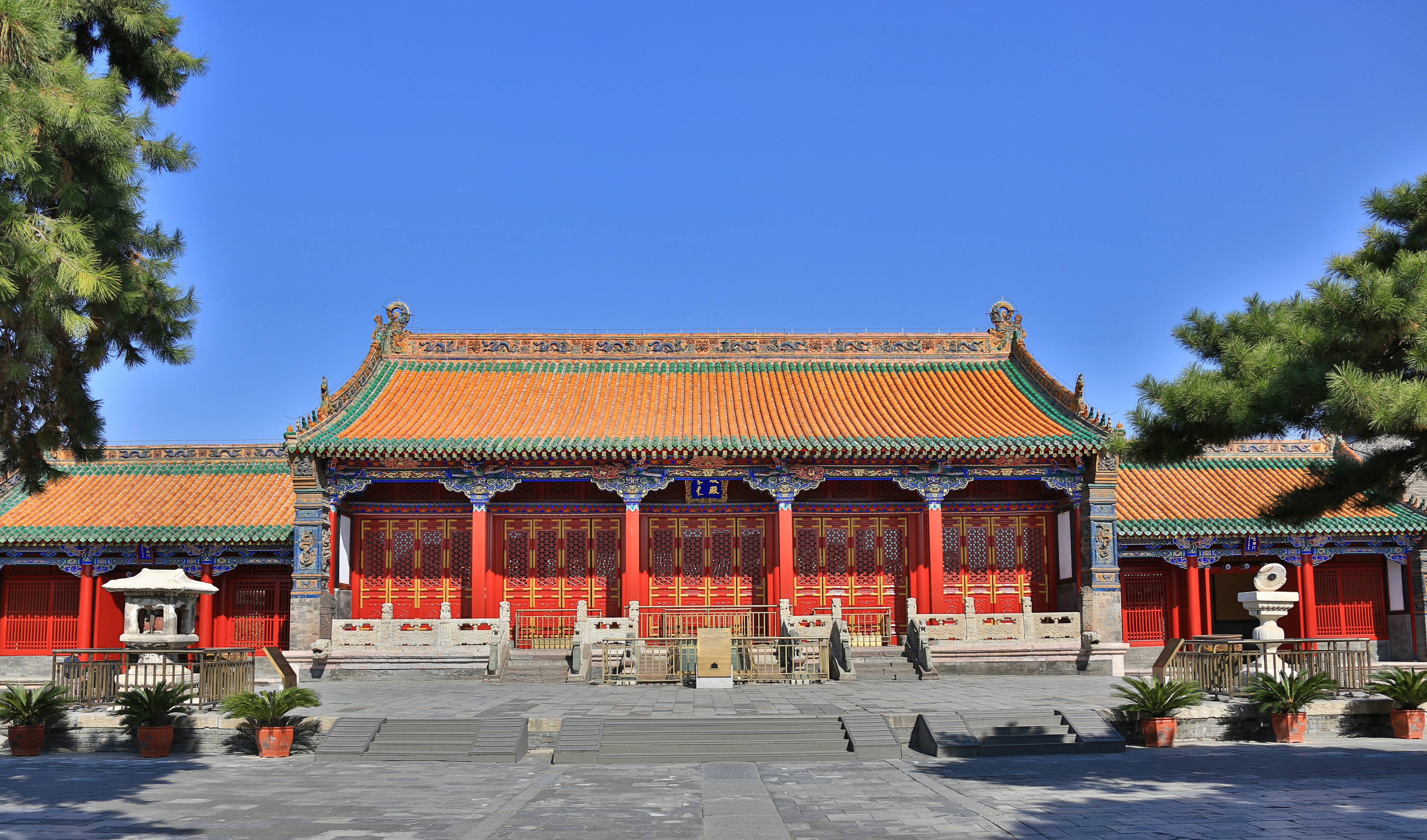 始建于1625年,俗称“八角殿”。大政殿为八角重檐攒尖式建筑,殿顶上装饰有与佛教宝塔相似的精美琉璃构件,殿身八面各装有6扇门而并无砖墙,基座采用须弥座形式砌筑。大政殿殿身通高19.2米,为大木架结构,榫卯相接而建,从里到外没有使用过一根钉子。八角形的殿顶象征八旗,表现出八旗组织在满族政权中的特殊作用,有着“八方归一”的喻义。殿檐下的金龙盘柱、木制斗拱和柱头兽面等装饰,分别体现着汉、蒙、藏不同民族的装饰风格。大政殿是多民族艺术融合的杰作,它因其独特的建筑形式和极高的艺术价值,现已成为沈阳市的地标性建筑。