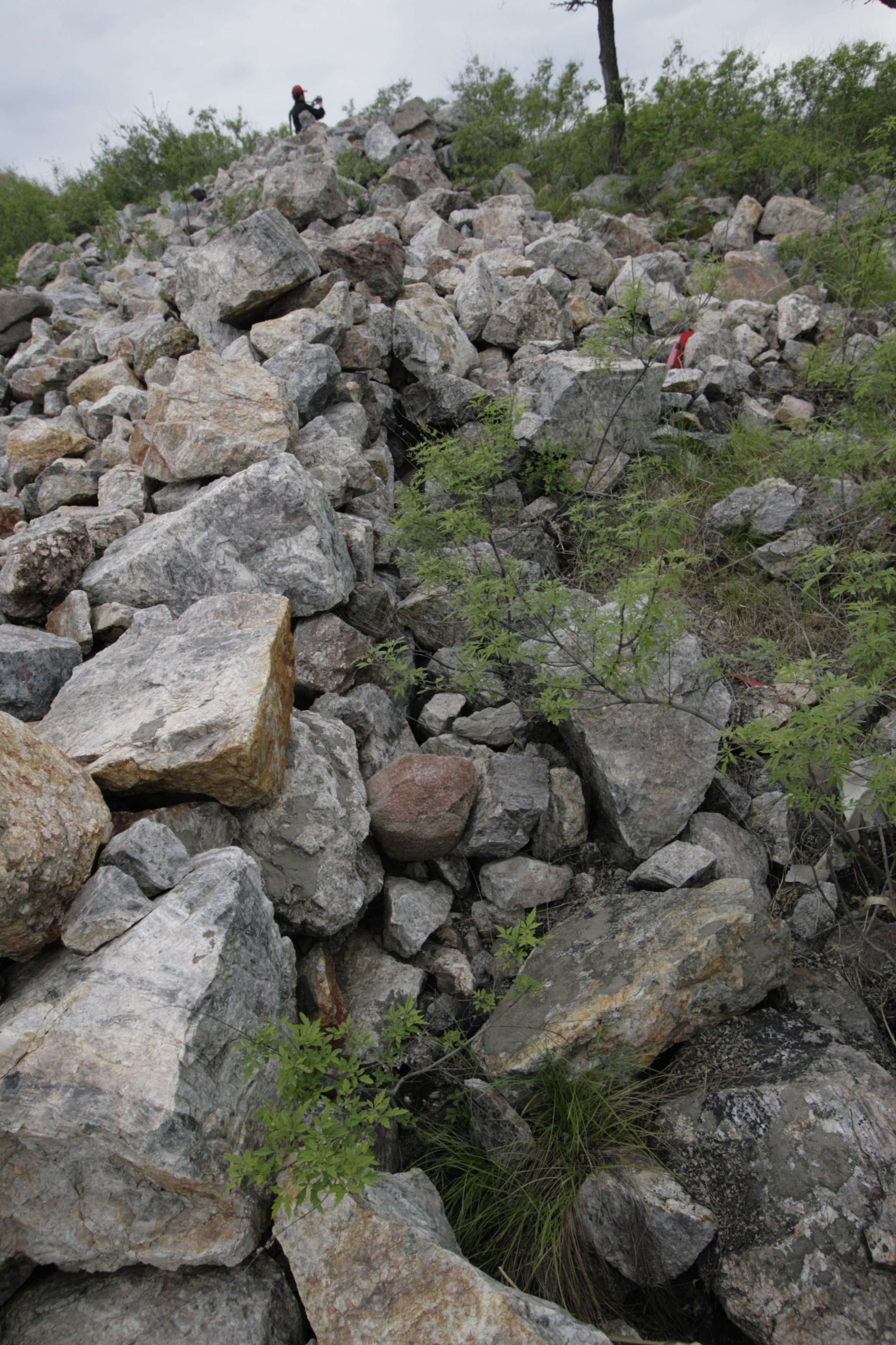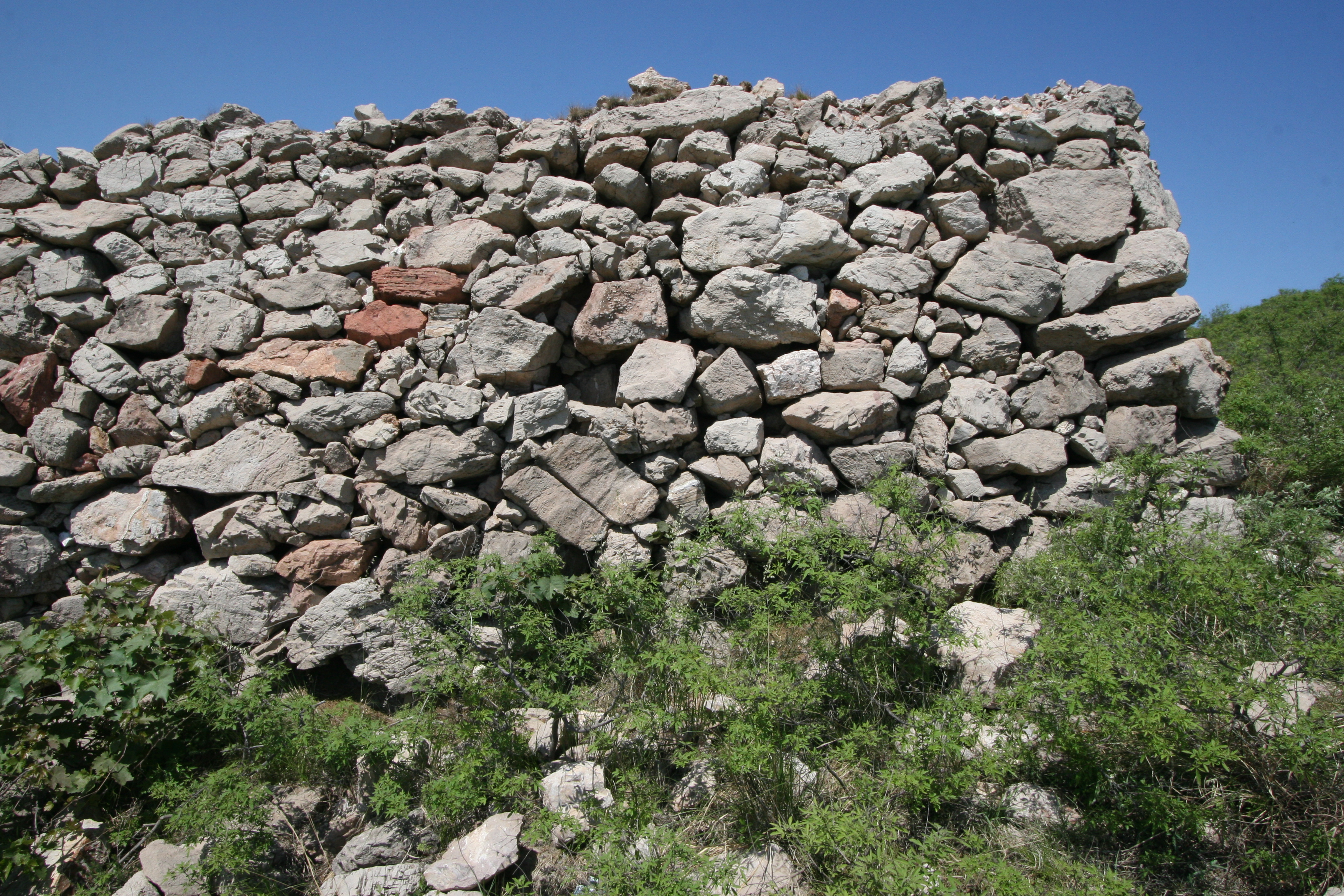 6号敌台建在虹螺岘镇小毛家沟屯东北植股山南侧山坡上,在自然山体上用大块毛石包砌,内填碎石,台体平面呈长方形。