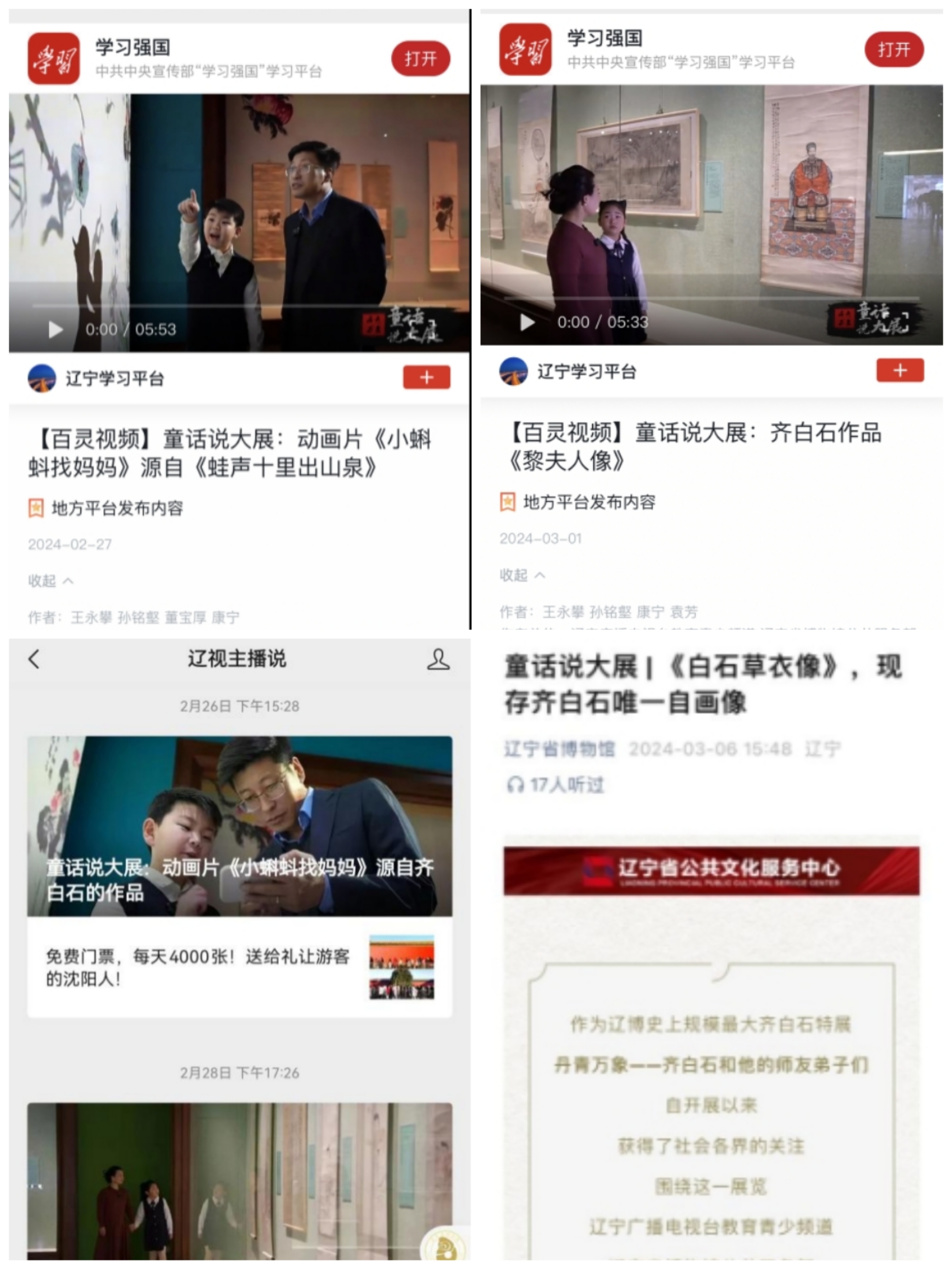 “童心绘国宝 童话说大展”融媒体活动依托《丹青万象——齐白石和他的师友弟子们》主题展览,充分发挥博物馆社会教育职能和青少年教育功能,“童心绘国宝”活动,立足辽博的主题展览和精品文物,组织中小学开展参观学习、绘画创意等活动;“童话说大展”活动选拔博物馆小志愿者,与博物馆工作人员和历史文化学者联合拍摄短视频7个。