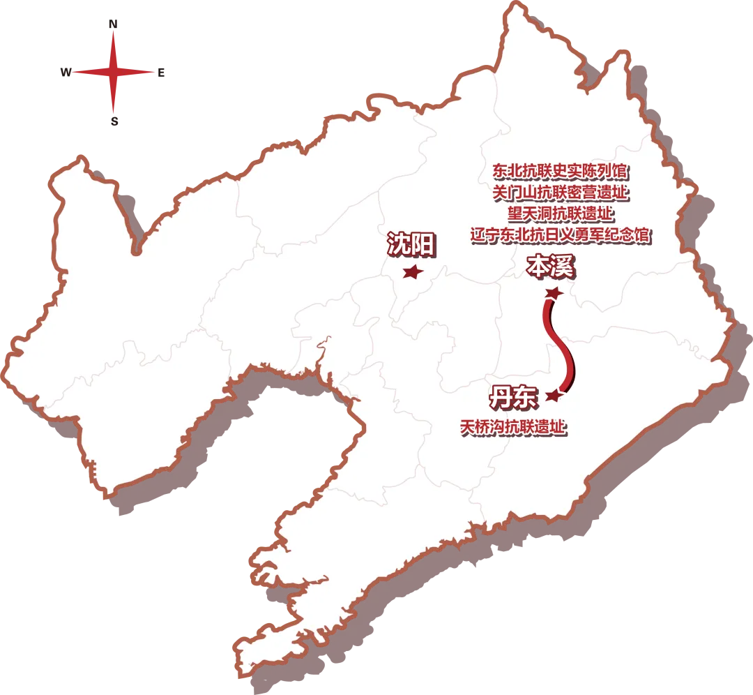 线路节点:东北抗联史实陈列馆—关门山抗联密营遗址—望天洞抗联遗址—辽宁东北抗日义勇军纪念馆—天桥沟抗联遗址
