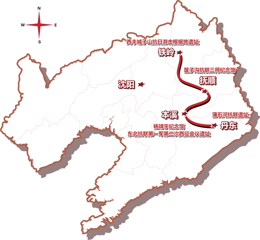 线路节点:杨靖宇纪念馆—蒲石河抗联遗址—东北抗联第一军第二次西征会议遗址—西丰城子山抗日游击根据地遗址—筐子沟抗联三师纪念馆